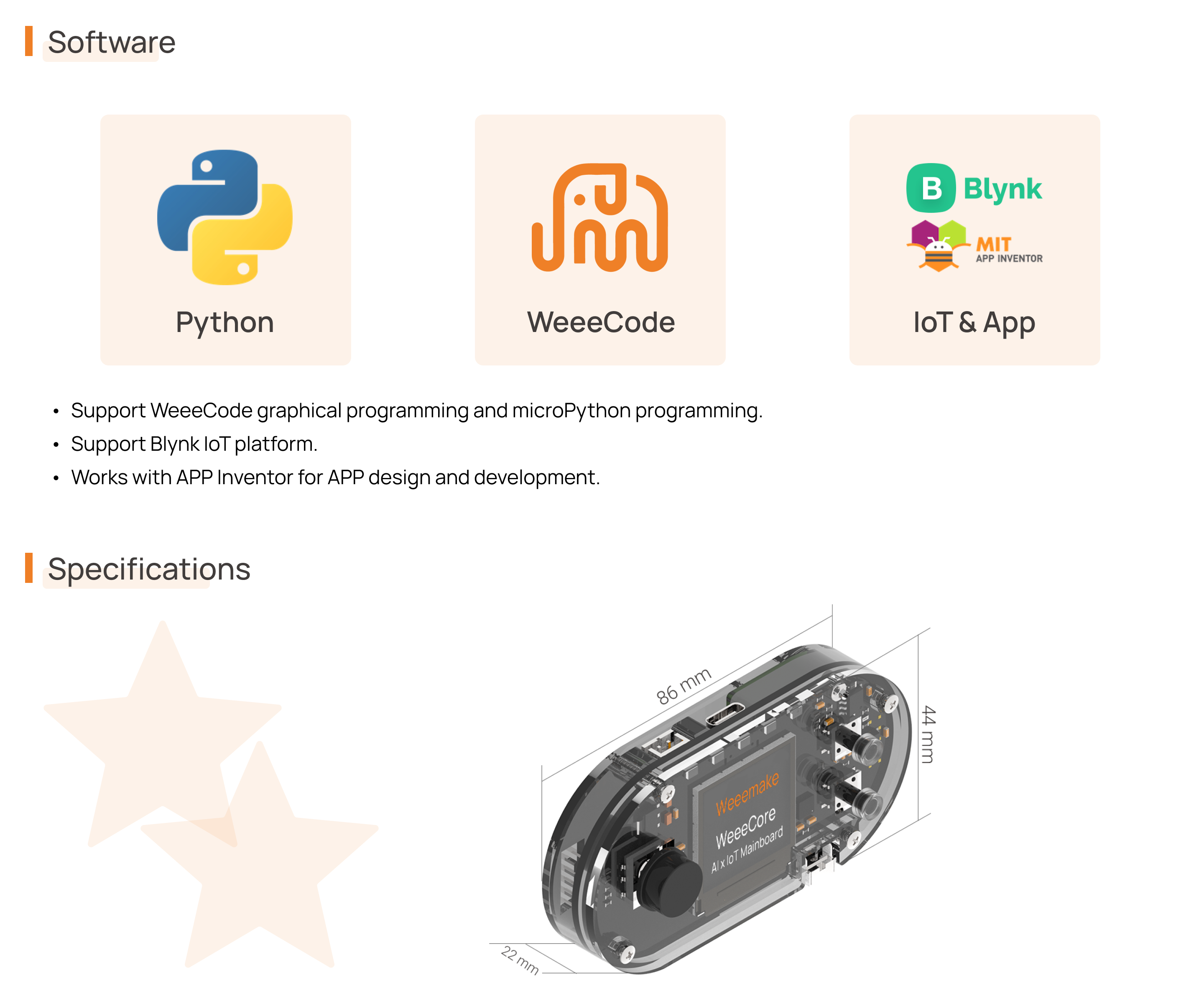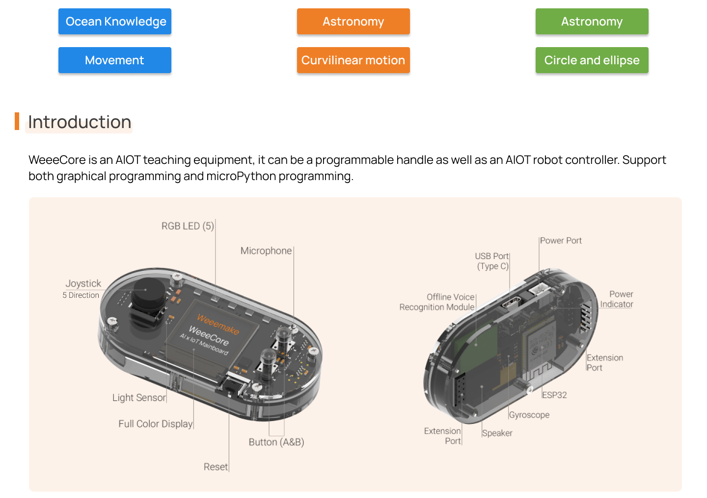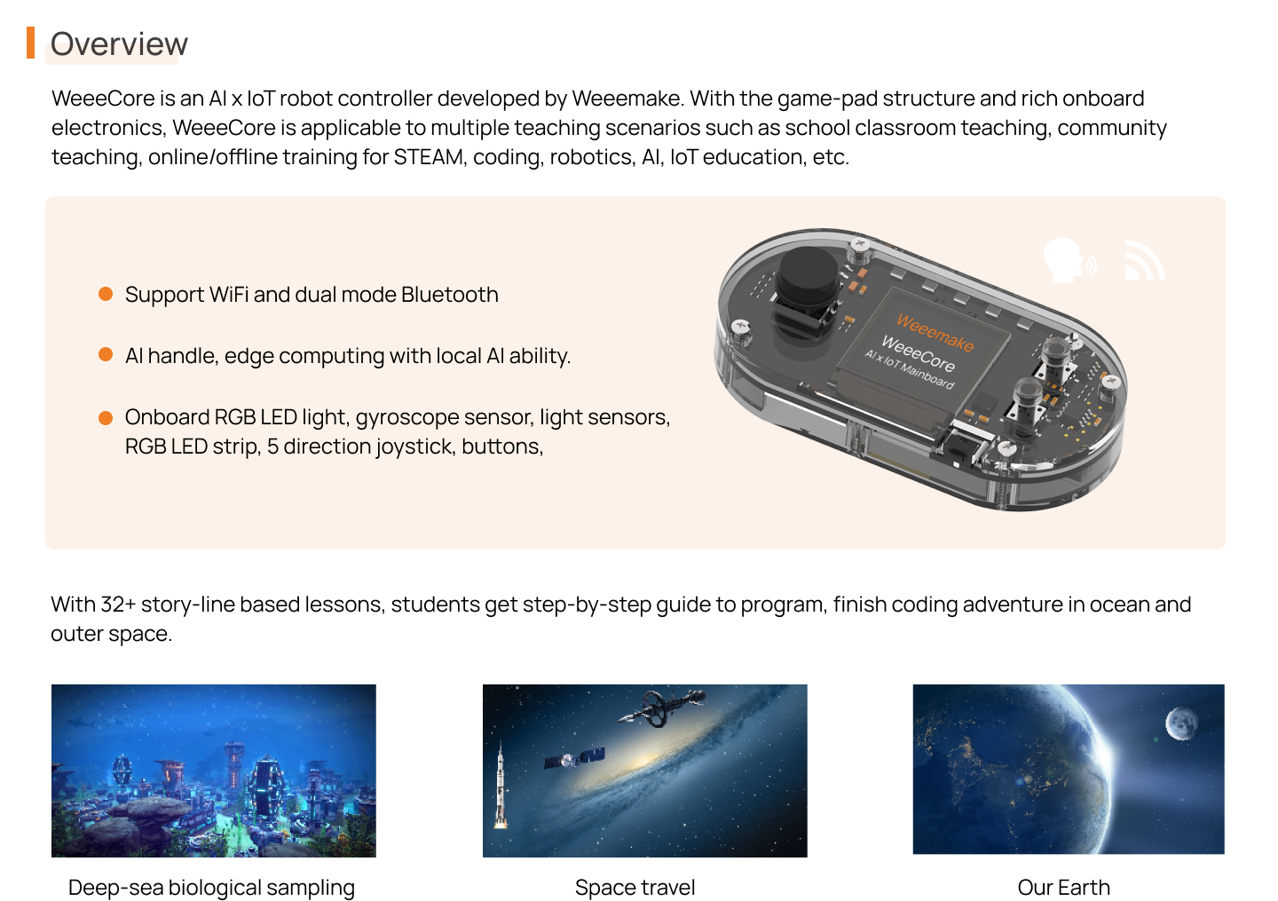 Weeemake has developed WeeeCore, an AI x IoT education robot controller that is perfect for various teaching scenarios, including school classroom teaching, community teaching, and online/offline training for STEAM, coding, robotics, AI, IoT education, and more. The game-pad structure and rich onboard electronics make WeeeCore highly versatile and useful.